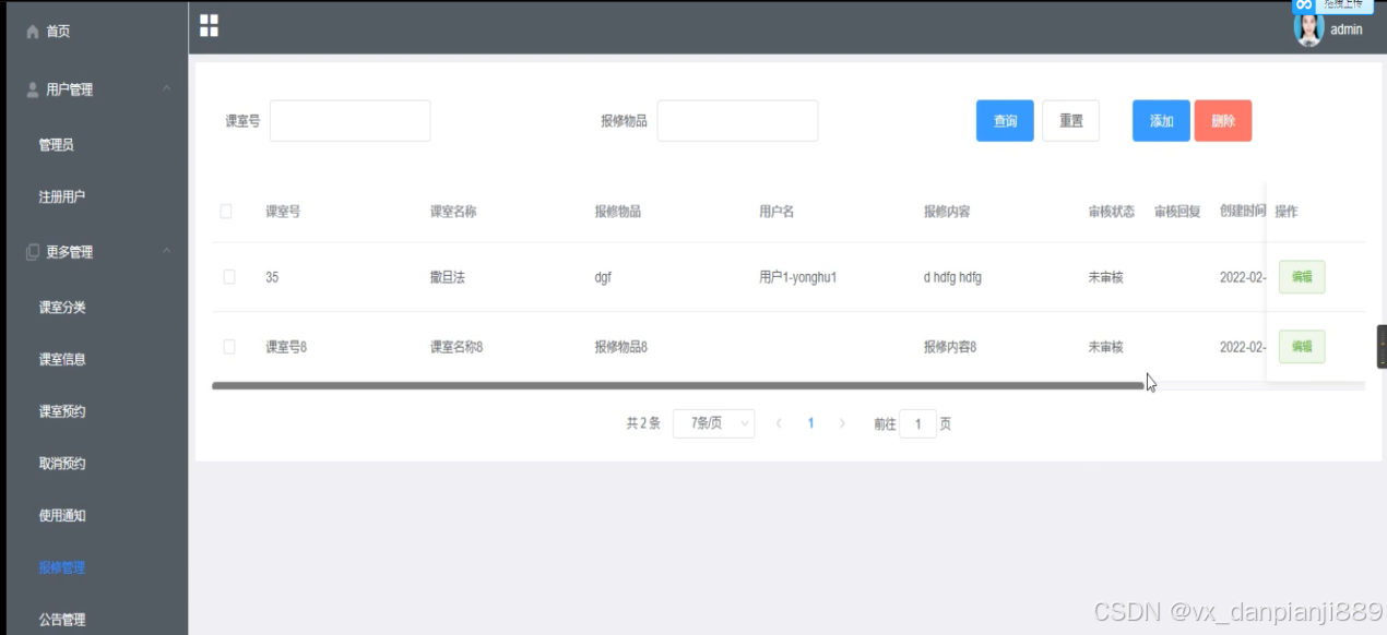 报修管理信息{ID,课室号,课室名称,报修物品,用户名,报修内容,审核状态,审核回复,智能推荐,创建时间,更新时间}