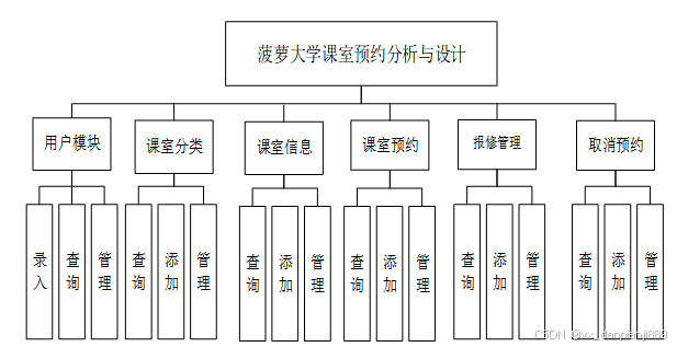 菠萝大学课室预约分析与设计是中需要存储不少用户课室预约信息,用户可以查看课室预约信息,进行预约查看课室信息,管理员可以添加,修改,删除课室预约信息等,具体的结构图如下:
