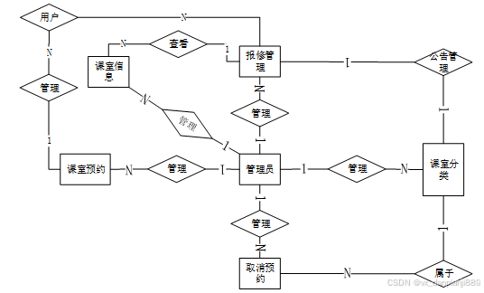菠萝大学课室预约分析与设计根据上面的E-R实体图,就再找到实体与实体之间的关系来,制作总的E-R图,实体之间的关系一共有4种,也就是一对一,多对一,一对多和多对多,总的E-R图是设计数据库表格的依据,如下图是网站的总E-R图。