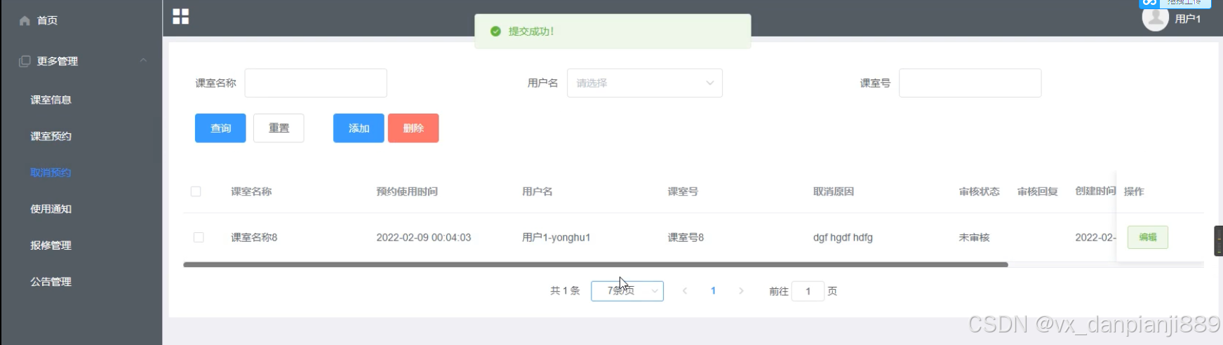 取消预约信息{ID,课室名称,预约使用时间,用户名,课室号,取消原因,审核状态,审核回复,智能推荐,创建时间,更新时间}