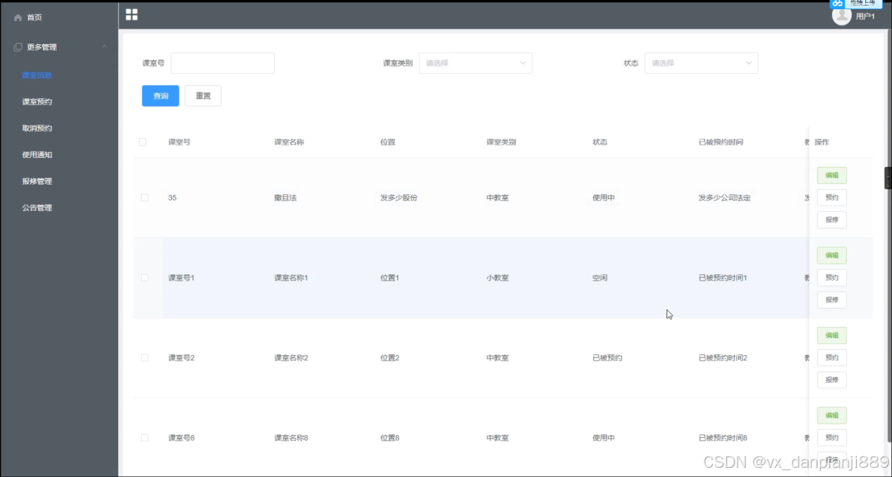 课室信息{ID,课室号,课室名称,位置,课室类别,状态,已被预约时间,教室设备,智能推荐,创建时间,更新时间}