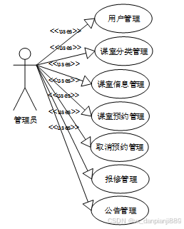 系统设计的目的是分析系统包括的所有功能结构,为开发人员设计开发和实现系统做好准备工作。经过前期的需求调查、分析和整理之后,确定的总体需求主要包括多个模块,分别是:用户管理、课室分类管理、课室信息管理、课室预约管理、取消预约管理、使用通知、报修管理、公告管理。系统整体角色分为两个部分,一是注册用户、二是管理员。权限分布也是很明显,用户是在除去浏览信息之外还具有查询和管理自己账户信息、课室申请等权限;管理员是最高权限拥有者。