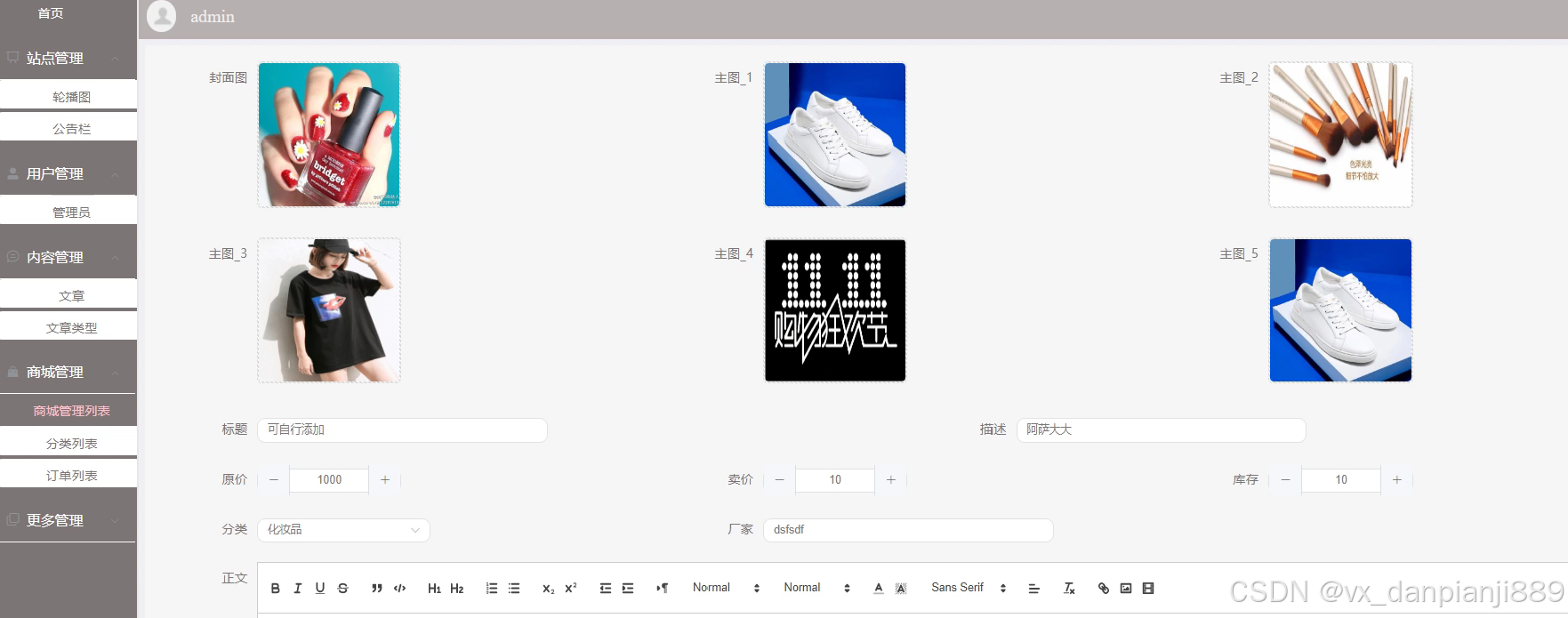 该功能包括对商品进行添加、删除、修改,发布。首先管理员进入后台主页,在左边菜单栏选择相应的功能操作。