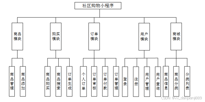 社区购物小程序的前台中,用户模块和商品模块进行数据交互,实现购买的功能。前台的功能主要包括用户模块、商品模块、订单模块和订单模块。