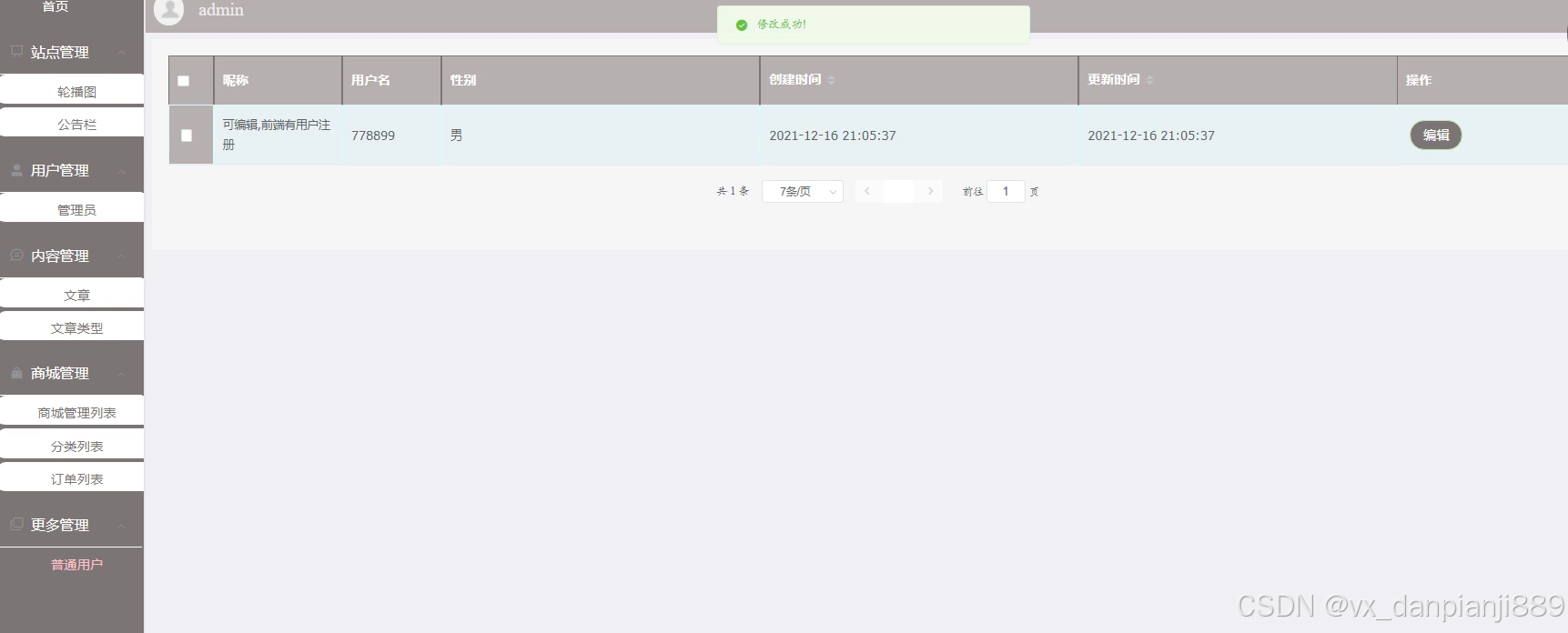 | 1、管理员在后台主界面选择“用户管理”。 4、管理员在用户列表中选择一个用户,点击“编辑”按钮。 6、管理员填写用户信息,点击“保存修改”按钮。 | 2、系统从数据库中获取用户信息。 3、系统打开用户列表界面。 5、系统打开修改用户信息界面。 7、系统将更改后的添加到数据库中。 8、系统提示“操作成功”。 9、系统跳转到用户管理界面。 | |