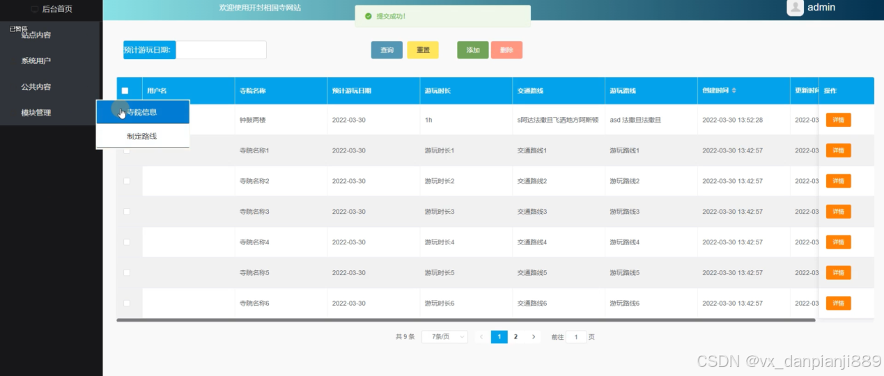 (5)模块管理:当点击“模块”这一菜单的时候,会出现寺院信息+制定路线这两个子菜单,能够对寺院信息进行增删改查操作;