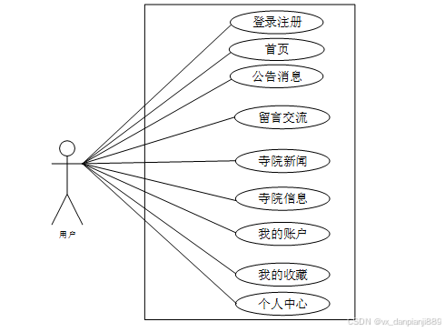 (3)确定好系统使用的技术,进行在线确认系统所划分的用户角色,并且根据用户角色划分确定所要设计的功能模块,对于开封相国寺网站的设计主要划分别为管理员和用户角色,并所使用的功能模块也相应不同,但是系统的数据库实现的内容是交互的,用户可以随时根据自己的需求进行课程信息,对于系统工作人员可以根据自己的分管内容进行在线信息的处理及操作,管理员获取到所有用户的详细数据信息,并根据需求进行第一时间处理解决。