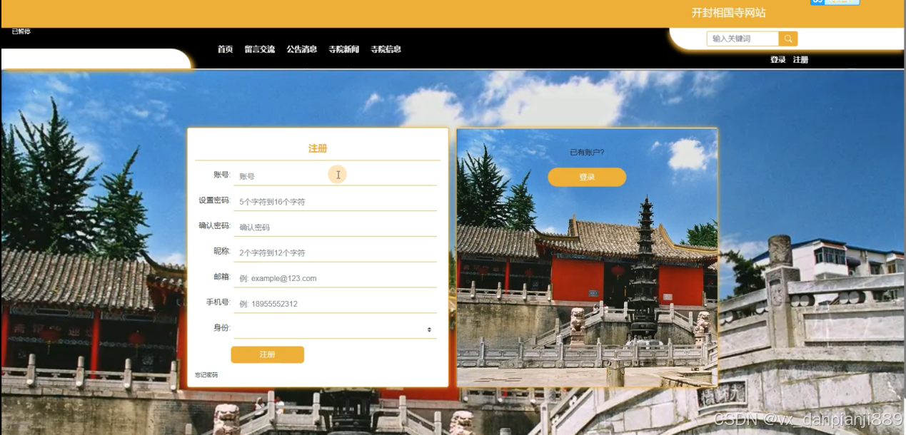 (1)注册登录模块:用户想要进入本开封相国寺网站系统中对信息进行评论、留言交流以及寺院新闻等操作的时候,就必须要登录到系统当中,要是新的用户没有开封相国寺网站系统的账号的话,点击“注册”按钮,就会进入到新用户注册这个界面上,用户输入对应的账号(必须填写)+密码(必须填写)+确认密码(必须填写,而且要与密码一直)+昵称+邮箱+手机号+选择用户身份等等,,然后点击“注册”,系统在用户这一数据库中会查询账号是不是存在,两次密码是不是一样,都填写正确就会注册成功,然后再进行登录,如果是之前已经注册过的用户很长时间没有使用,忘记密码,也可以点击“忘记密码”进行找回;