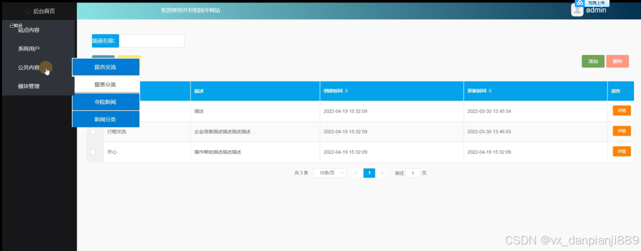 此功能为管理员的功能,管理员点击“公共内容”菜单后,会展示出留言交流+留言分类+寺院新闻+新闻分类四个子菜单,任何可以对其进行增删改查操作;其界面展示如下图4.7所示。