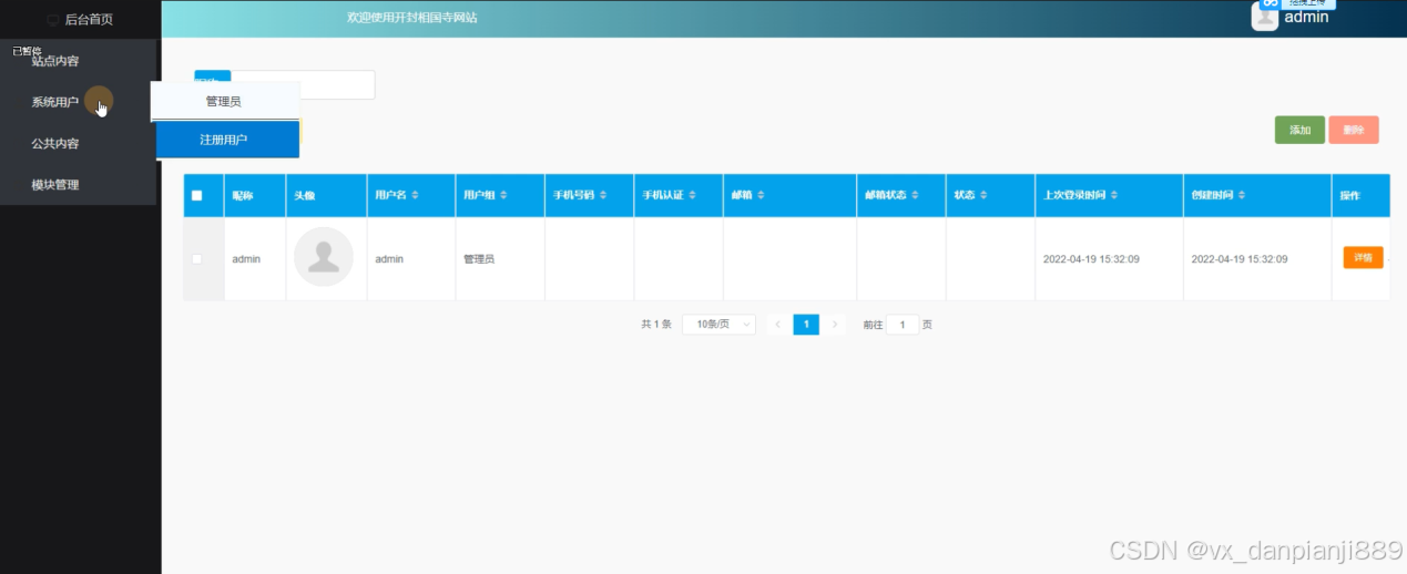 (3)用户管理:当点击“用户管理”这一菜单的时候,会出现管理员+注册用户两个子菜单,可以对这两个模块进行增删改查操作;