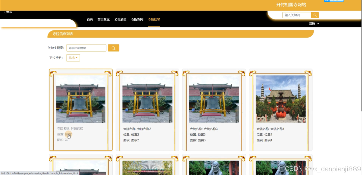 (5)寺院信息:在首页导航栏上我们会看到“寺院信息”这一菜单,我们点击进入进去以后,会看到所有管理员在后台发布的寺院信息,我们选择想要了解寺院的信息,查看寺院信息,可以评论+收藏;