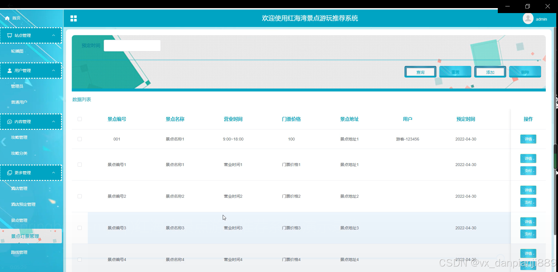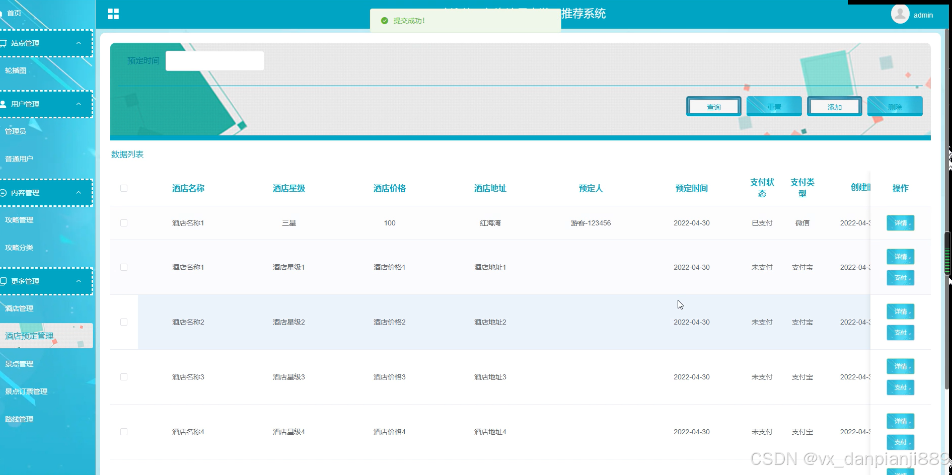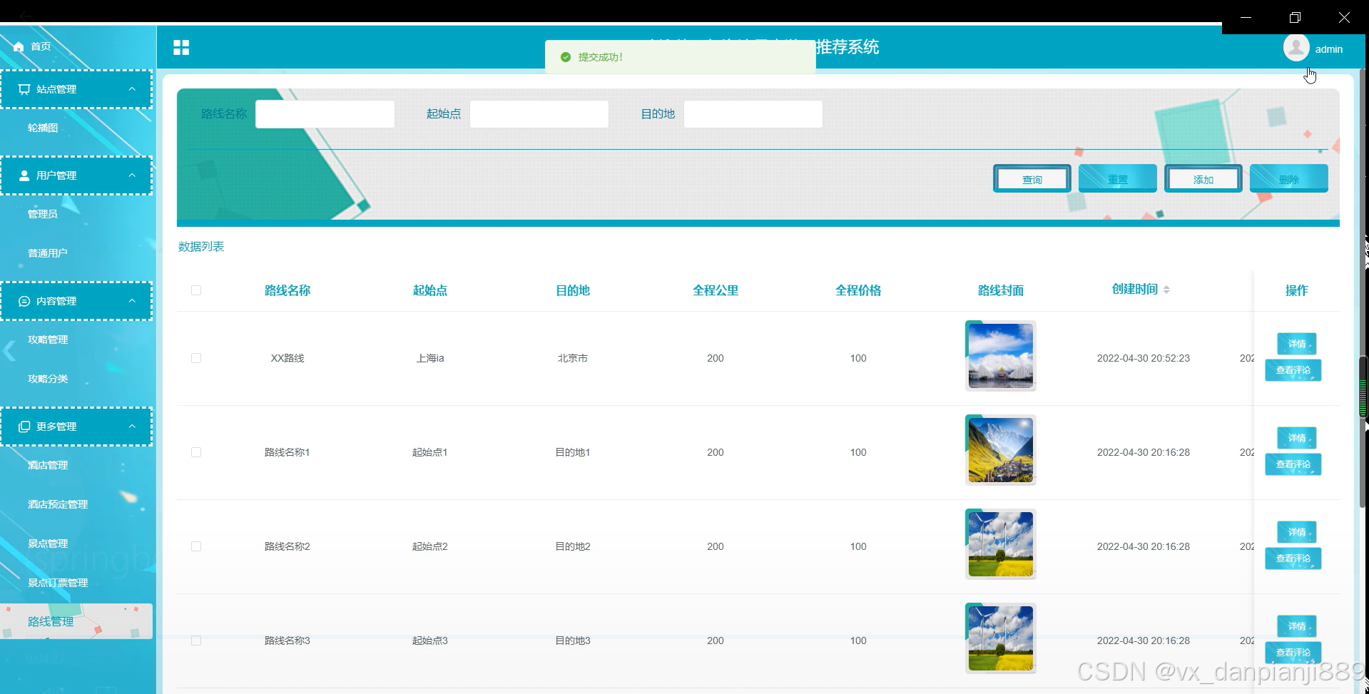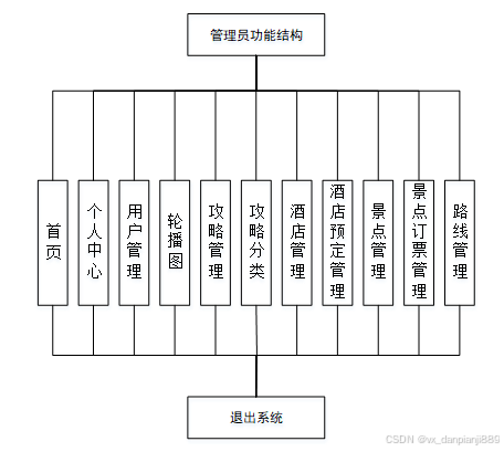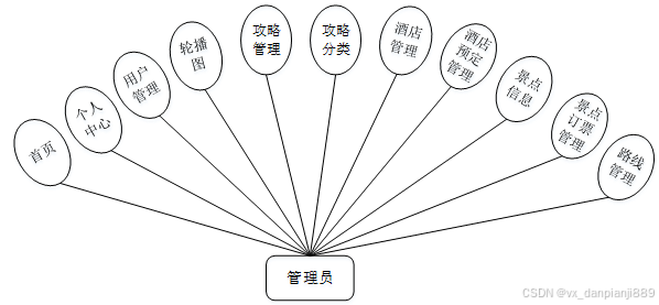 - 管理员功能模块包括:首页、站点管理(轮播图)用户管理(管理员、普通用户)内容管理(攻略管理、攻略分类)更多管理(酒店管理、酒店预定管理、景点管理、景点订票管理、路线管理)系统管理模块。