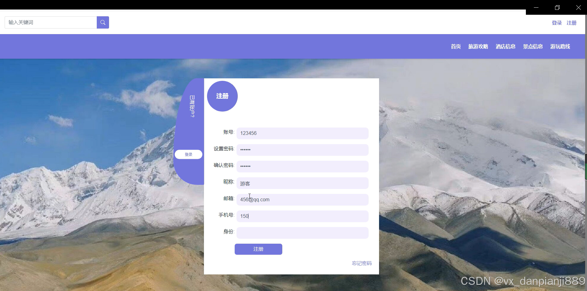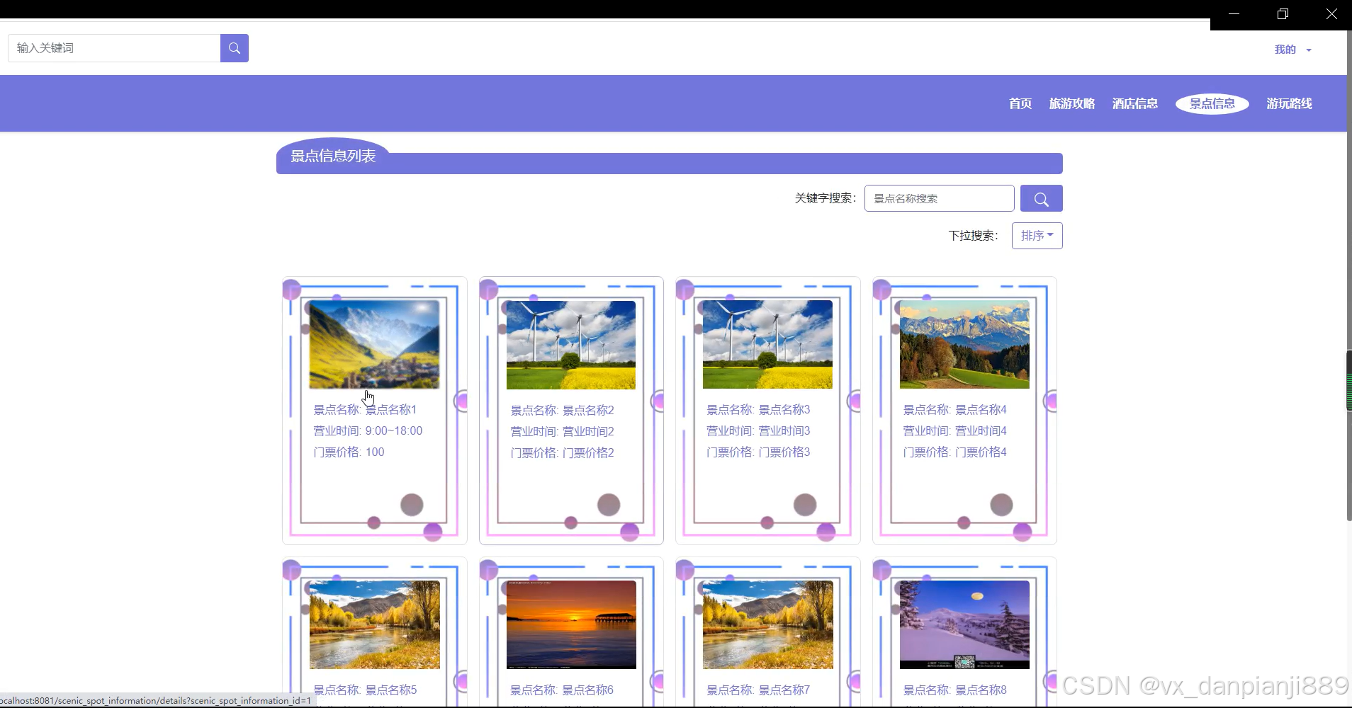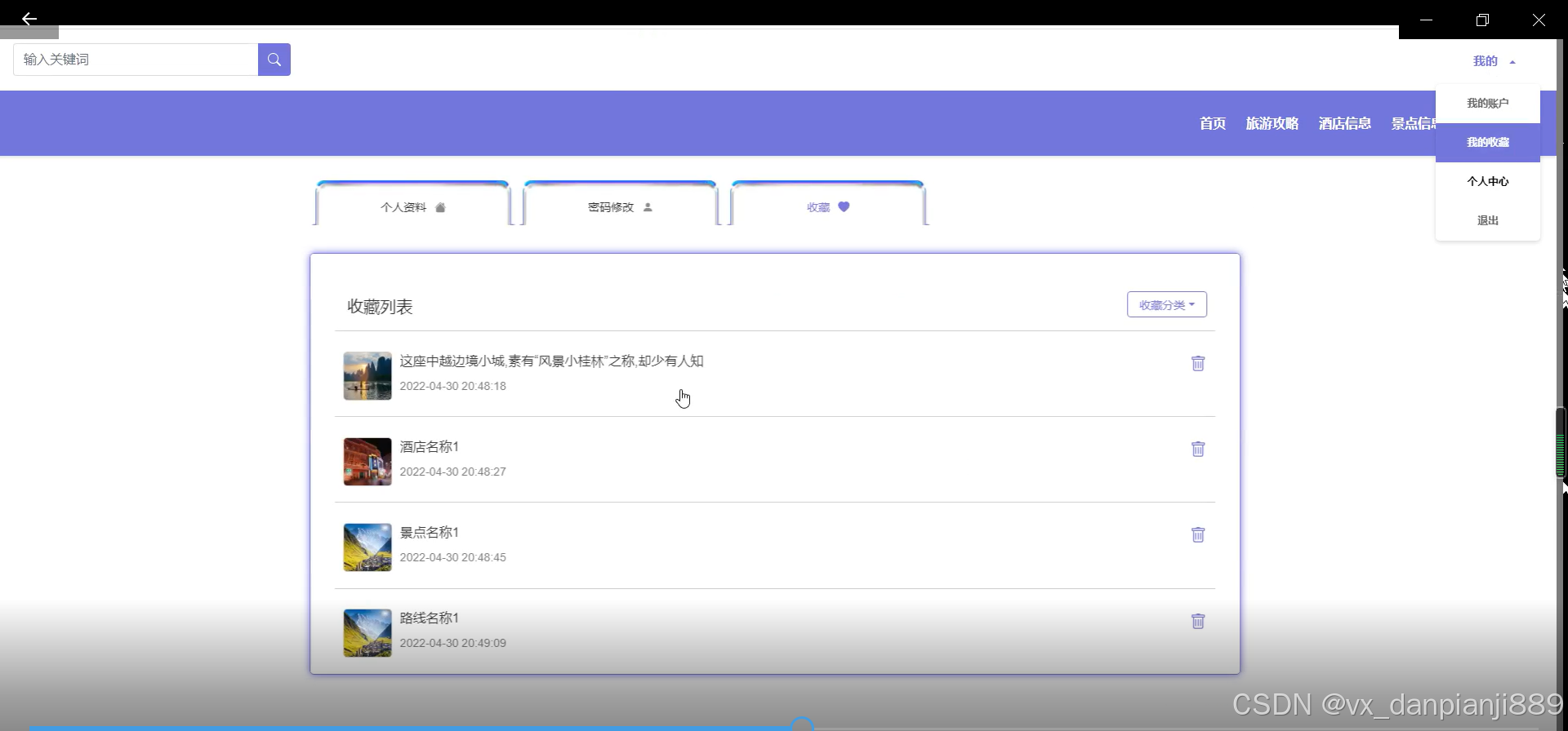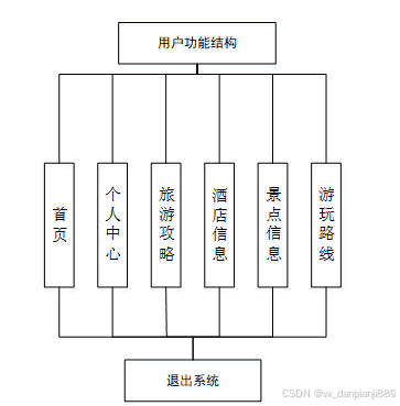 - 用户功能模块用户模块包括:首页、旅游攻略、酒店信息、景点信息、游玩路线、个人中心、后台管理模块。