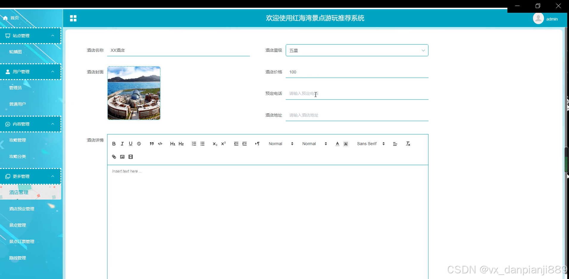 该系统具有首页、站点管理(轮播图)用户管理(管理员、普通用户)内容管理(攻略管理、攻略分类)更多管理(酒店管理、酒店预定管理、景点管理、景点订票管理、路线管理)等功能。首先在该系统中用户可以通过本网站的路线管理和酒店预定管理功能进行查看,旅游景点进行全方位了解,可以毫无顾虑的进行线上预订,或者通过用户模块来规划自己的旅游计划。其次用户注册登陆本网站后,用户可以进入个人后台来管理首页、公告消息、红海湾景点资讯、路线管理、酒店住宿、美食小吃等功能。最后在主页页面,增加了红海湾景点资讯,使用户可以直接快速接触到最丰富的内容,提高了用户体验感,增加了销售量。
