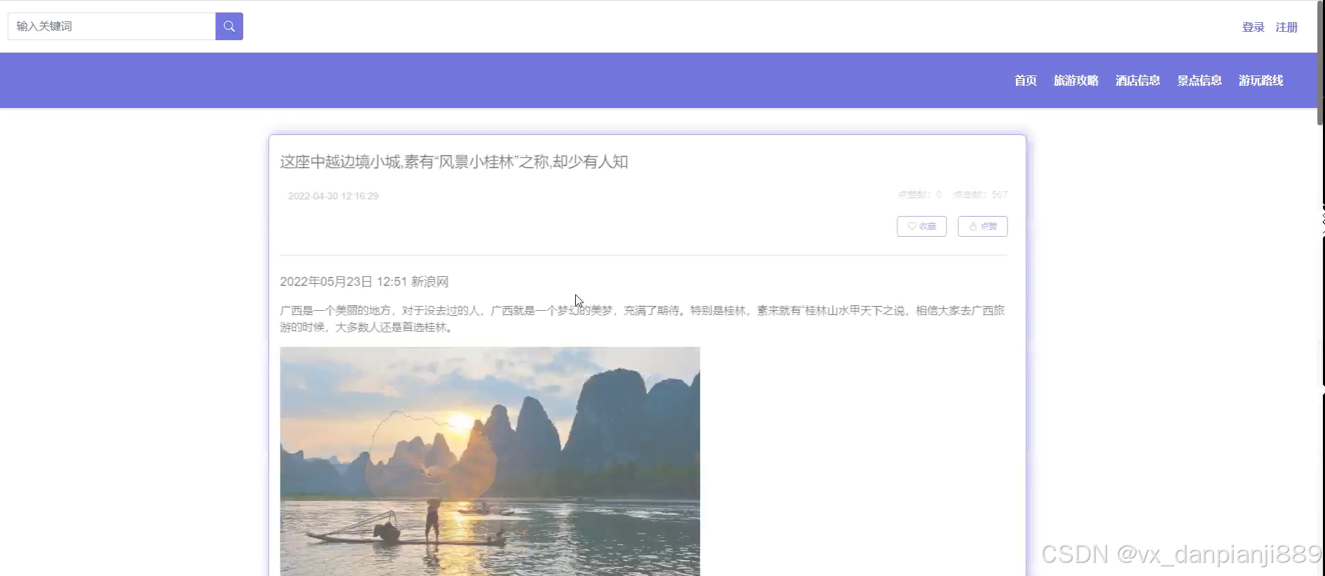The Red Bay scenic spot play recommendation system adopts B / S structure, java development language, MySQL database and other technologies. The system is mainly divided into two parts: administrator and user. The main functions of administrator management include: Administrator: home page, site management (rotation map), user management (administrator, ordinary users), content management (strategy management, strategy classification) and more management (hotel management, hotel reservation management, scenic spot management, scenic spot booking management, route management), etc. User management mainly includes: home page, tourism strategy, hotel information, scenic spot information, play route management and other functions, which basically realizes the information management process of the whole red bay scenic spot play recommendation system. Based on the general red bay scenic spot play recommendation system, this system adds the function of pushing the latest information on the home page, which is convenient for users to browse quickly. It is an efficient, dynamic and interactive Red Bay scenic spot play recommendation system.