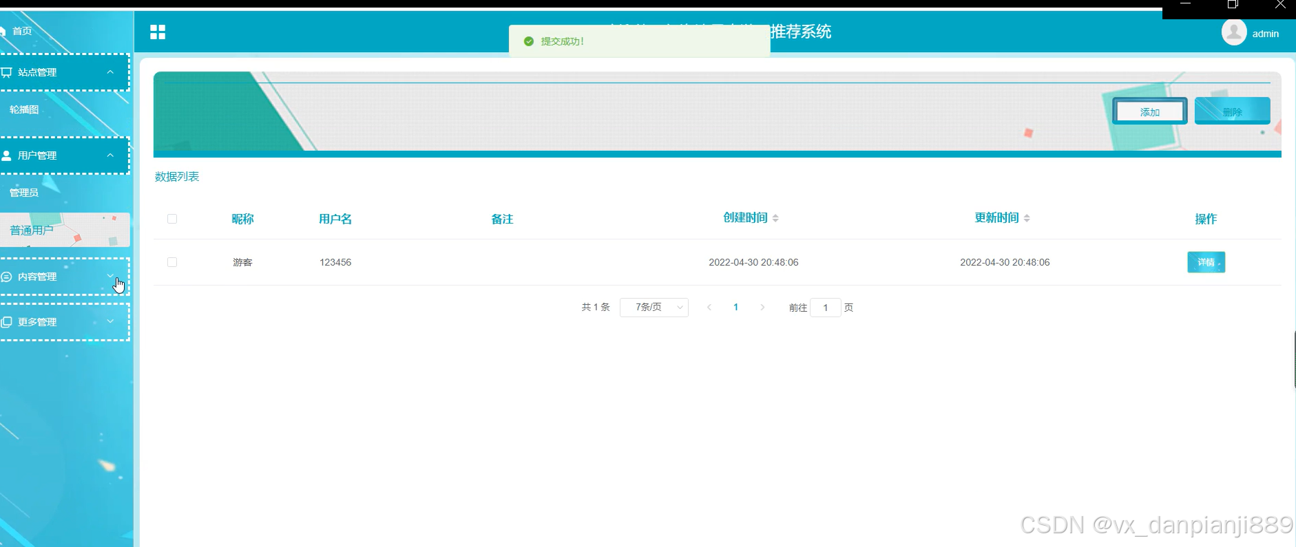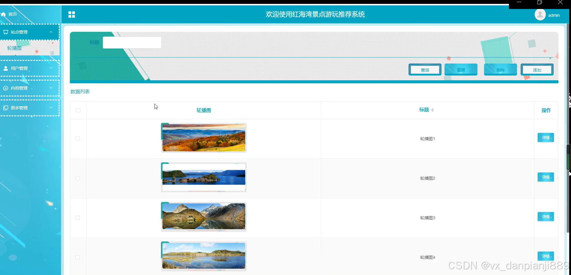 管理员登录进入红海湾景点游玩推荐系统可以查看首页、站点管理(轮播图)用户管理(管理员、普通用户)内容管理(攻略管理、攻略分类)更多管理(酒店管理、酒店预定管理、景点管理、景点订票管理、路线管理)管理、系统管理等内容,如图5-7所示。