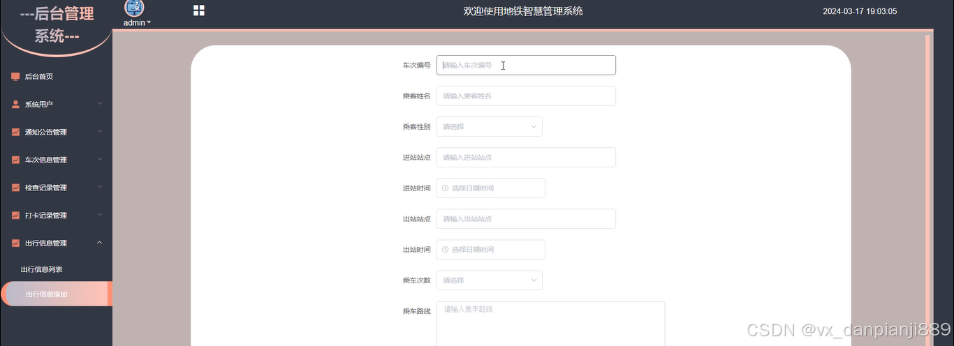 (8)出行信息管理:管理员点击可查看出行信息列表和出行信息添加;点击“出行信息添加”,输入车次编号、乘客信息,选择乘客性别,输入进站站点,选择进站时间,输入出站站点,选择出站时间,输入乘车车次、乘车路线和出行备注,点击“提交”按钮进行添加。