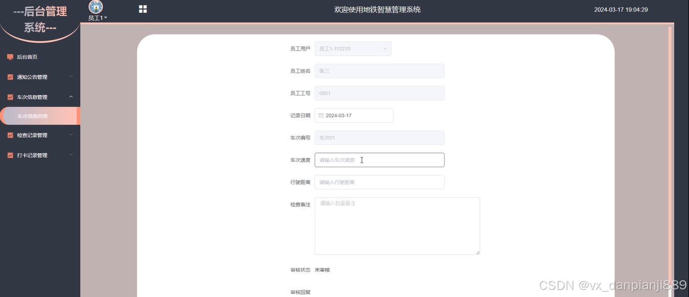 (3)车次信息管理:用户点击可查看车次信息列表,同时可点击“检查记录”进行天机记录信息,包括填写记录日期、车次编号、车次速度、行驶距离、检车备注。
