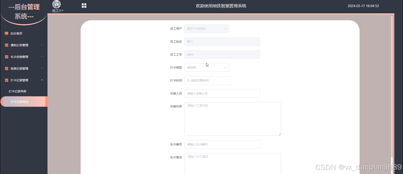 (5)打卡记录管理:用户点击可查看打卡记录列表和打卡记录添加;点击“打卡记录添加”,选择打卡类型、打卡日期,输入交接人员、交接内容、车次编号和车次情,点击“提交”按钮进行添加。