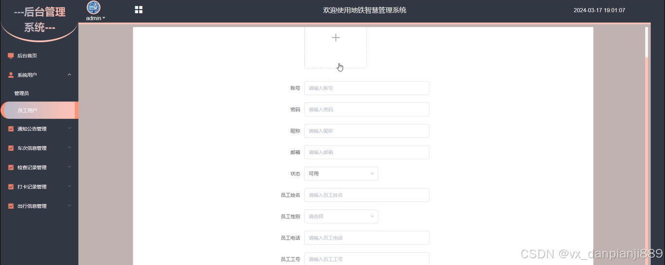 (3)系统用户:管理员点击可查看管理员和员工用户;如需添加员工用户,点击右侧“添加”按钮,上传头像,输入账号、密码、昵称、邮箱,选择状态,输入员工姓名、员工性别、员工电话和员工工号,点击“提交”按钮进行添加;同时可对系统用户进行增删改查。