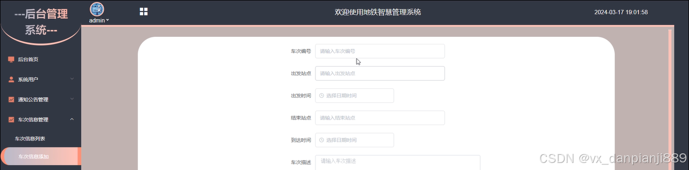 (5)车次信息管理:管理员点击可查看车次信息列表和车次信息添加;点击“车次信息添加”,输入车次编号、出发站点,选择出发时间,输入结束站点,选择到达时间,输入车次描述和车次备注,点击“提交”按钮进行添加。
