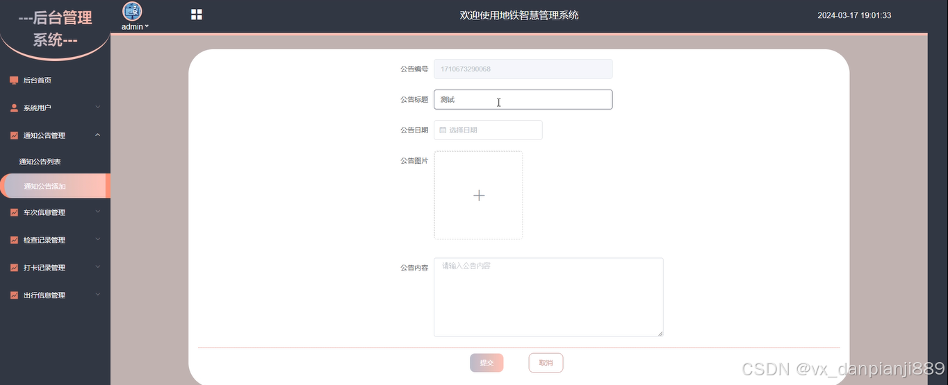 (4)通知公告管理:管理员点击可查看通知公告列表和通知公告添加;点击“通知公告添加”,输入公告标题,选择公告日期,上传公告图片,输入公告内容,点击“提交”按钮进行添加。同时可对通知公告进行增删改查。