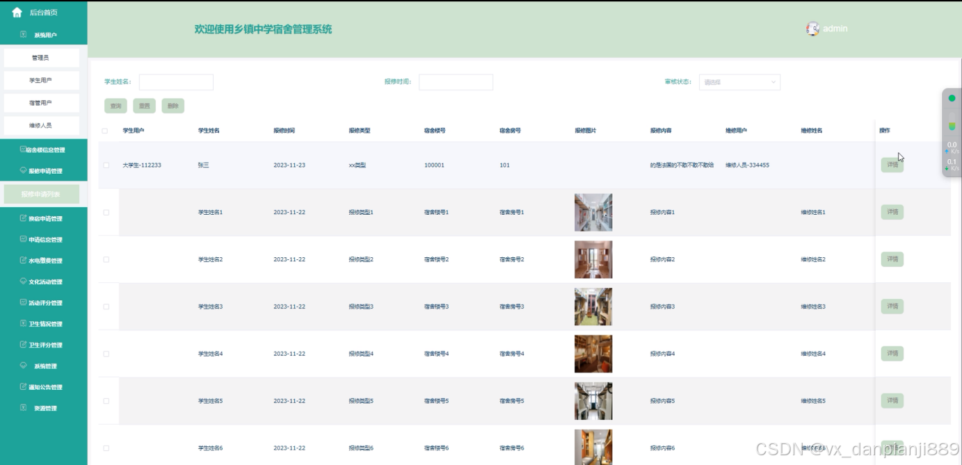 报修申请:管理员可以处理学生提交的宿舍设施报修申请,包括查看报修请求、分配维修人员、记录维修进度等。