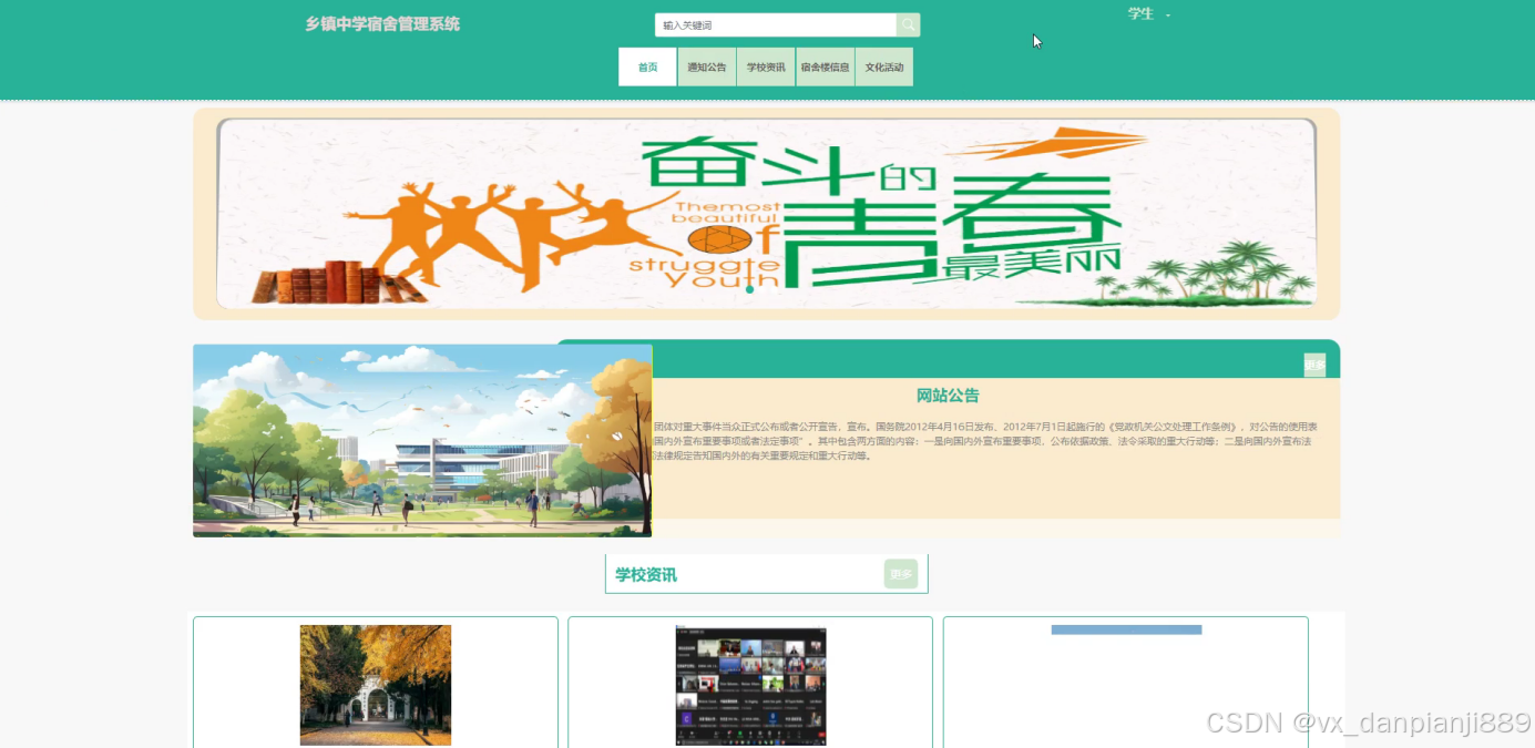乡镇中学宿舍管理系统,在系统中可以查看通知公告、学校资讯、宿舍楼信息(报修、换宿、申请、缴费)、文化活动等内容,如图5-1所示。