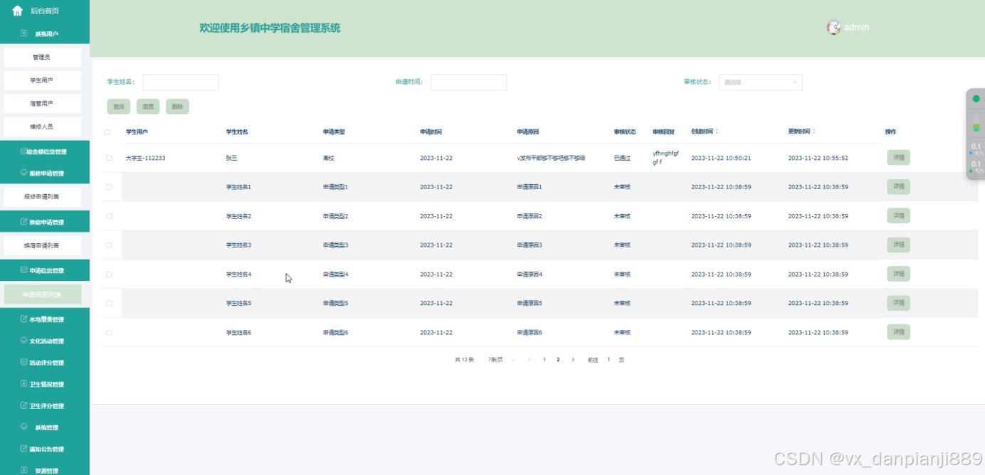 申请信息管理:宿管可以管理和维护学生提交的各类申请信息。这包括查看申请详情、修改申请状态、记录处理结果等。