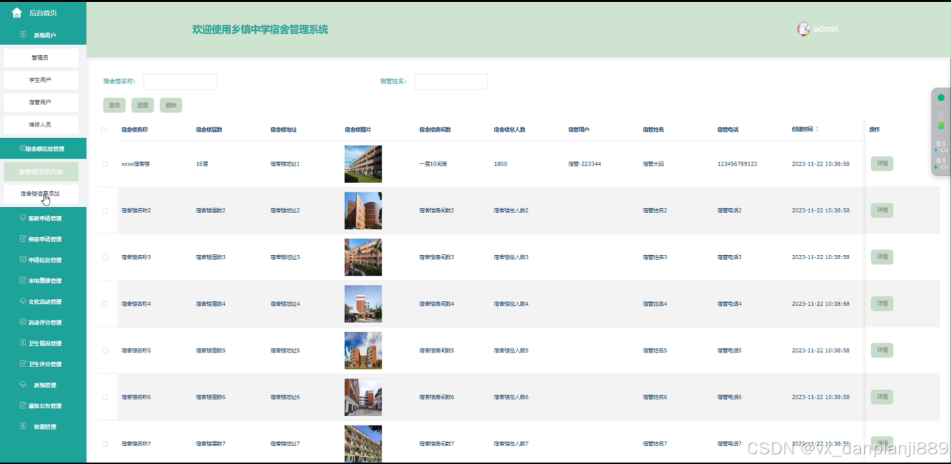 宿舍楼信息:管理员可以管理宿舍楼的相关信息,如添加宿舍楼、编辑宿舍楼信息、查看宿舍楼的使用情况等。