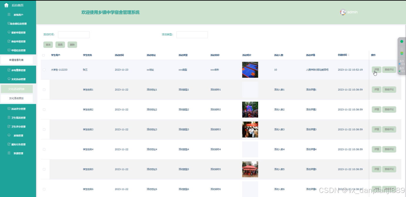 文化活动:管理员可以发布和管理校园文化活动,包括活动发布、报名管理、活动评分等。