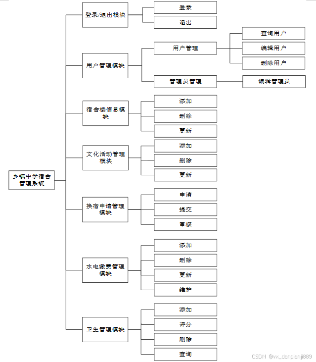 本研究的主要工作内容包括设计和开发乡镇中学宿舍管理系统的各个功能模块。这些模块包括用户管理、宿舍楼信息管理、报修申请管理、换宿申请管理、申请信息管理、水电缴费管理、文化活动管理、活动评分管理和系统管理等。通过完成这些工作,可以实现高效、便捷的宿舍管理。此外,还需要进行系统测试和调试,编写技术文档和用户手册,并确保系统的稳定性和功能完善性。通过这些工作的完成,将能够建立一套适用于乡镇中学的宿舍管理系统,提升管理效率,优化资源利用,提高学生满意度,并为学校提供全面、准确的宿舍管理解决方案。