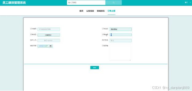 (4)订单上报:用户点击“订单上报”菜单可以进入到订单上报信息添加页面,根据页面提示输入订单编号、订单名称、订单类型、订单金额、接单人员、用户姓名、接单日期、订单详情等内容点击提交即可。