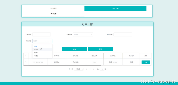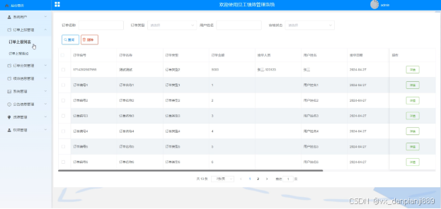 管理员点击“订单上报管理”会显示出所有的订单上报信息,支持输入订单名称、订单类型、用户姓名或审核状态对订单上报信息进行查询,也可以添加新的订单上报信息,对用户提交的订单上报信息进行审核。订单上报管理界面如下图5-7所示。
