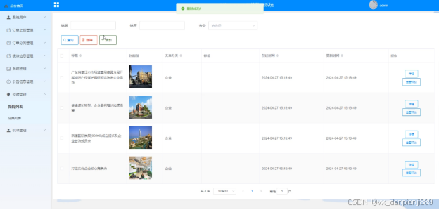 管理员点击“系统管理”菜单可以对系统的轮播图进行管理,查看到系统中的所有轮播图信息,对已经存在的轮播图,管理员可以修改,也可以发布新的轮播图信息。轮播图管理界面如下图5-9所示。