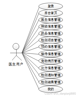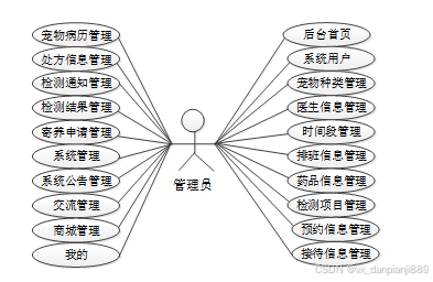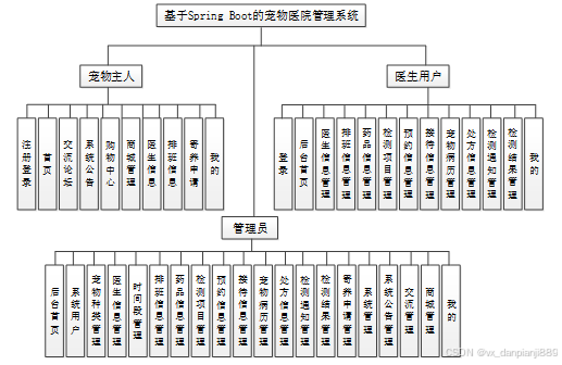 按照基于Spring Boot的宠物医院管理系统的角色,主要包括管理员、宠物主人和医生用户这三大功能模块,各模块功能如下。