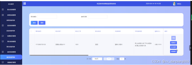 - 预约信息管理:管理员可以查看预约信息列表中某个用户的预约信息的详情和接待信息,可以对查询、重置和删除预约信息。