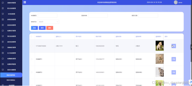 - 寄养申请管理:管理员可以添加寄养申请信息;可以查看寄养申请列表中某个用户提交的寄养申请的详情并进行审核和回复,可以对列表信息进行查询、重置和删除。