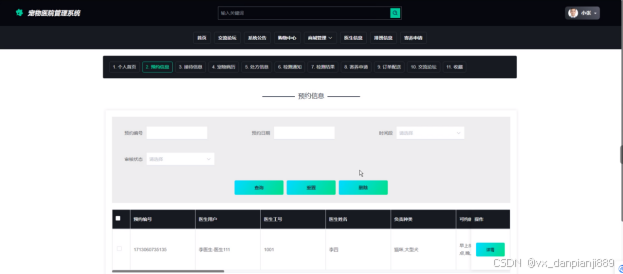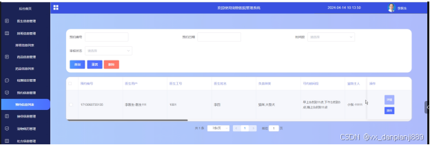 - 接待信息管理:用户可以查看接待信息列表中某个接待信息的详情并提交创建病历、处方信息和检测通知信息,可以查询和重置列表信息。宠物病历管理: