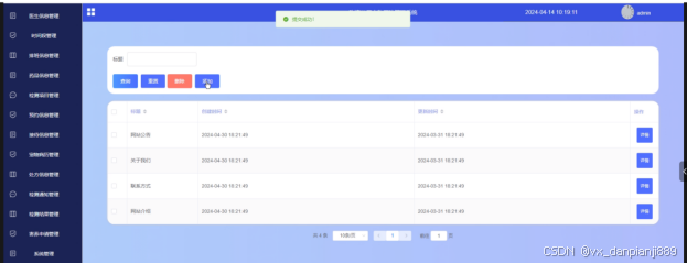 - 系统公告管理:系统公告管理界面是管理员用来管理系统中的公告的界面,管理员可以对系统公告进行增删改查操作。