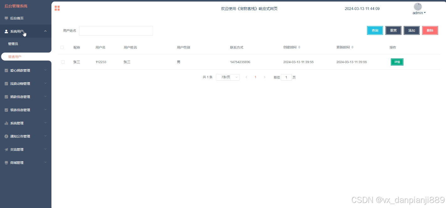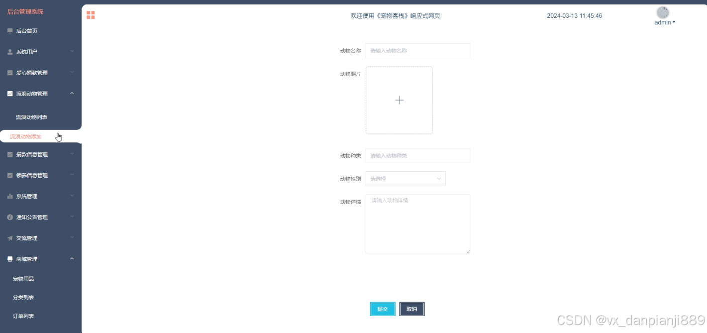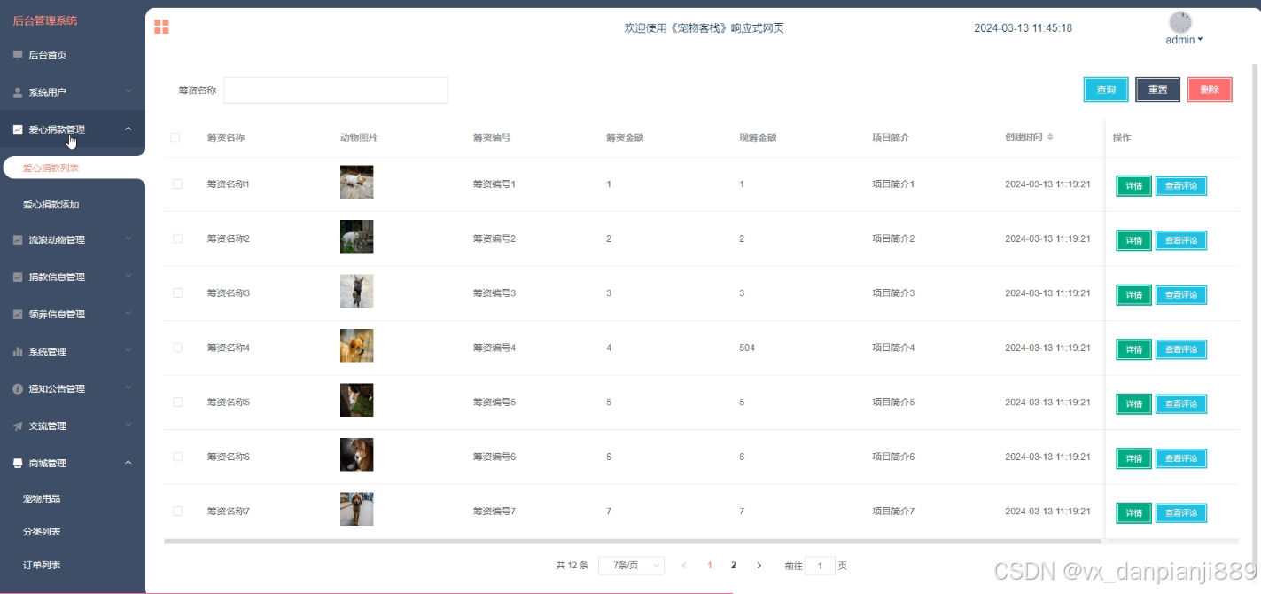 点击“商城管理”菜单可以对其下商城管理的宠物用品、分类列表、订单列表、订单配送进行增删改查。