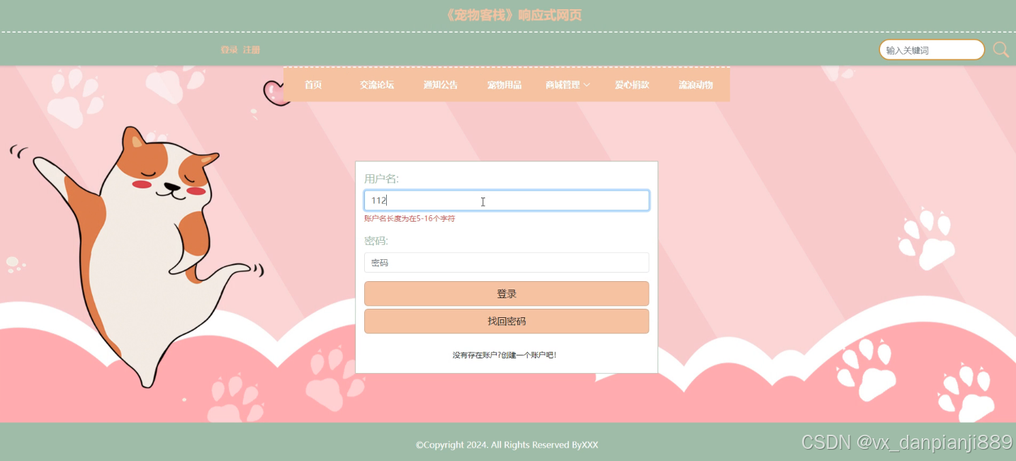 随着人们生活品质的提升,宠物已经成为许多家庭不可或缺的一部分。为了满足日益增长的宠物需求,我们提出了一个综合性的解决方案——《宠物客栈》响应式网页。这一平台不仅为宠物主人提供领养和管理的便捷渠道,同时也为宠物爱好者提供了一个丰富的商品选择空间。