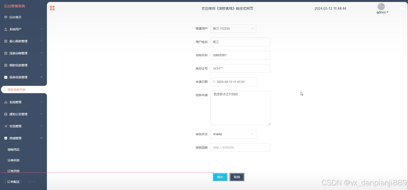 管理员执行领养信息管理,并可以操作相关内容,例如查看,编辑和删除。点击“领养申请”会显示出所有的领养申请信息,支持对领养申请信息进行查询,可以选择某一条领养申请信息,点击“删除”进行删除。