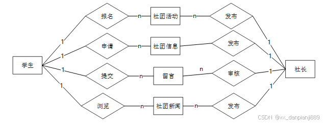 下面是整个高校社团管理系统中主要的数据库表总E-R实体关系图。