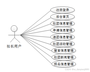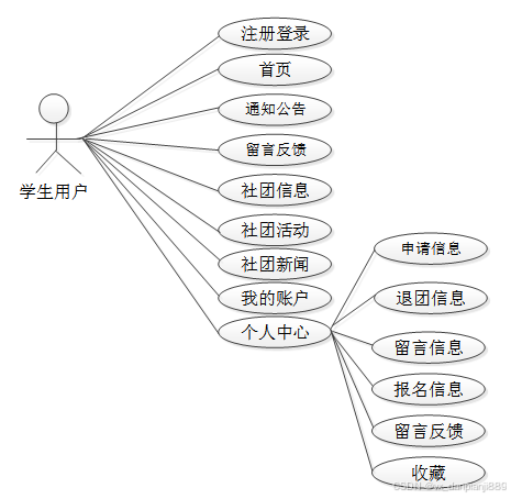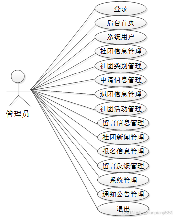 通过2.3功能的分析,得出了本高校社团管理系统的用例图: