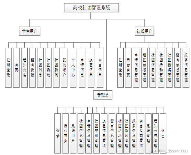 按照高校社团管理系统的角色,主要包括学生用户模块、社长用户模块和管理员这三大功能模块,各模块功能内容如下: