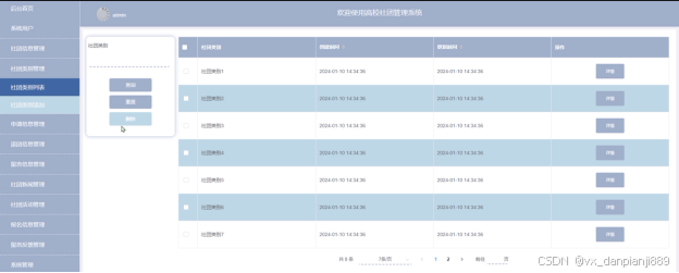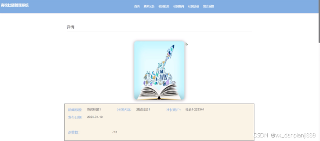 - 社团新闻管理:管理员可对前台展示的社团新闻信息进行查看详情、删除等管理操作。