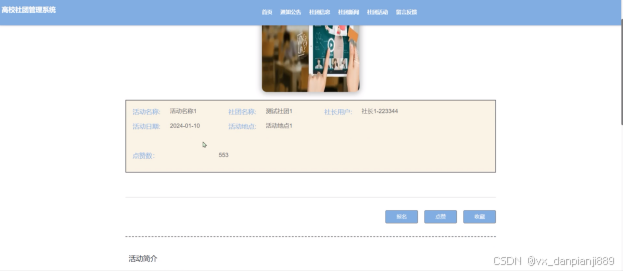 - 社团活动:用户可以查看社团活动列表中某一活动详情并进行点赞、收藏和发表评论和报名操作。