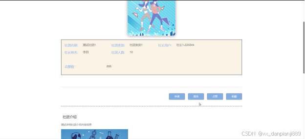 - 社团信息:用户可以查看社团信息列表中某一社团详情并进行点赞、收藏、发表评论、留言和申请入团提交操作。