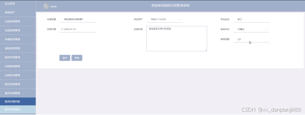 - 留言信息管理:社长用户在留言信息列表可查看所有学生的留言信息进行可进行回复操作。